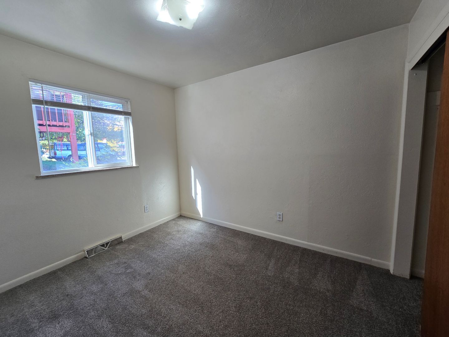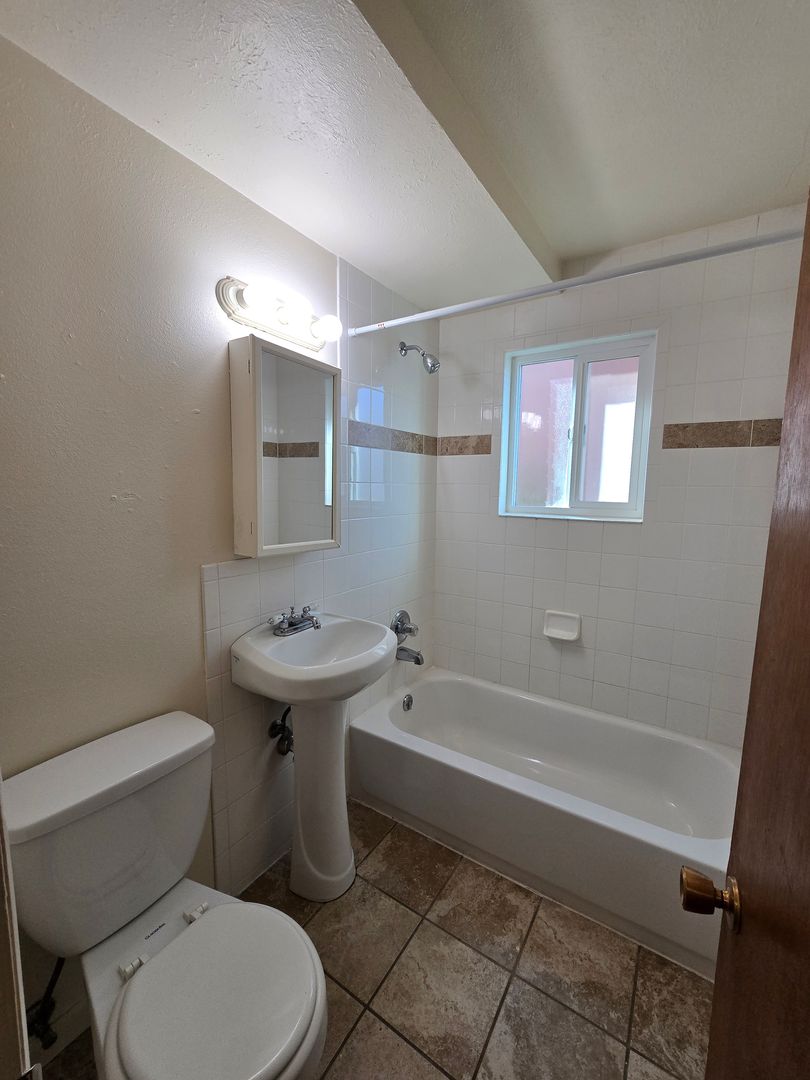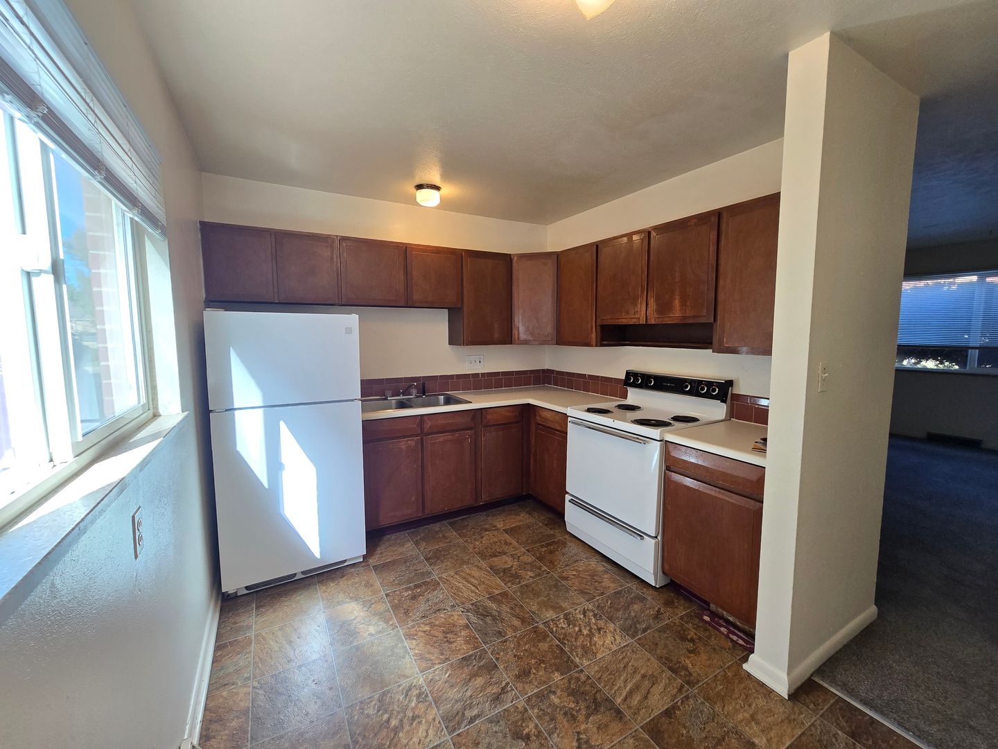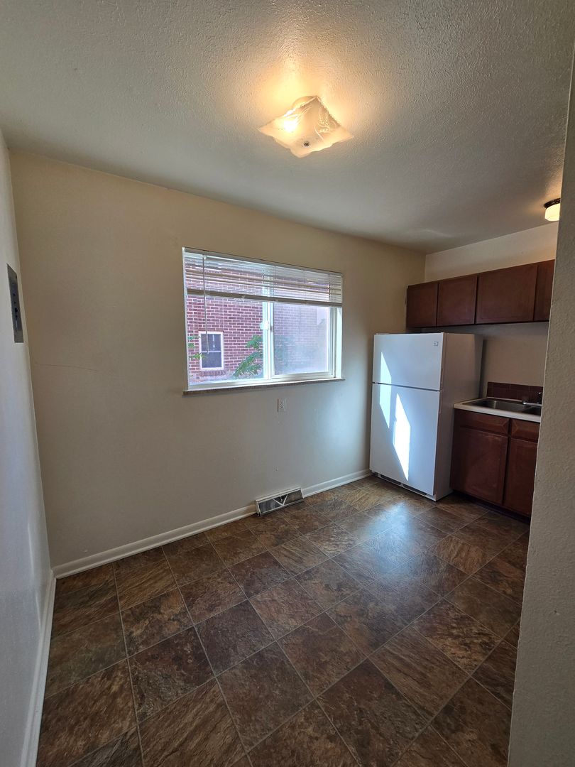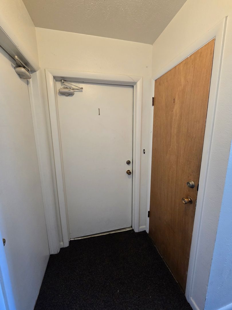 This ground level apartment features carpet throughout and large newer windows. The kitchen is secluded from the rest of the apartment, and includes an electric range, vinyl flooring, and wood cabinetry. The larger bedroom will be to the right of the hallway, with the smaller bedroom and full bathroom to the left. On-site coin operated laundry and off street parking available.